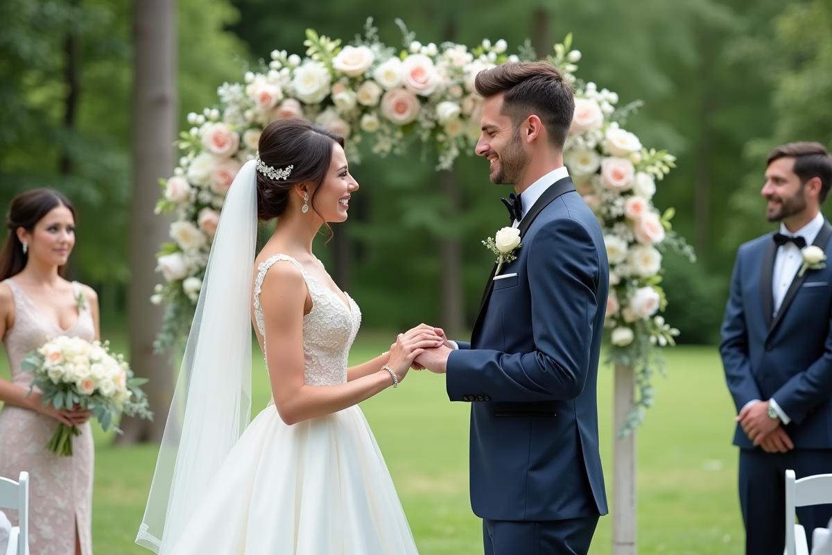 Pour la cérémonie, chaque détail pèse. L’arche, souvent pièce maîtresse, peut se décliner en bois flotté, en métal doré ou se couvrir de fleurs savamment structurées. Les assises jouent la diversité : chaises dépareillées, bancs rustiques, fauteuils vintage. On ajoute des guirlandes lumineuses, un tapis persan, et l’espace s’ancre. Des fleurs séchées ou fraîches, accompagnées de rubans, jalonnent le chemin vers l’autel, dessinant le fil conducteur de la mise en scène.